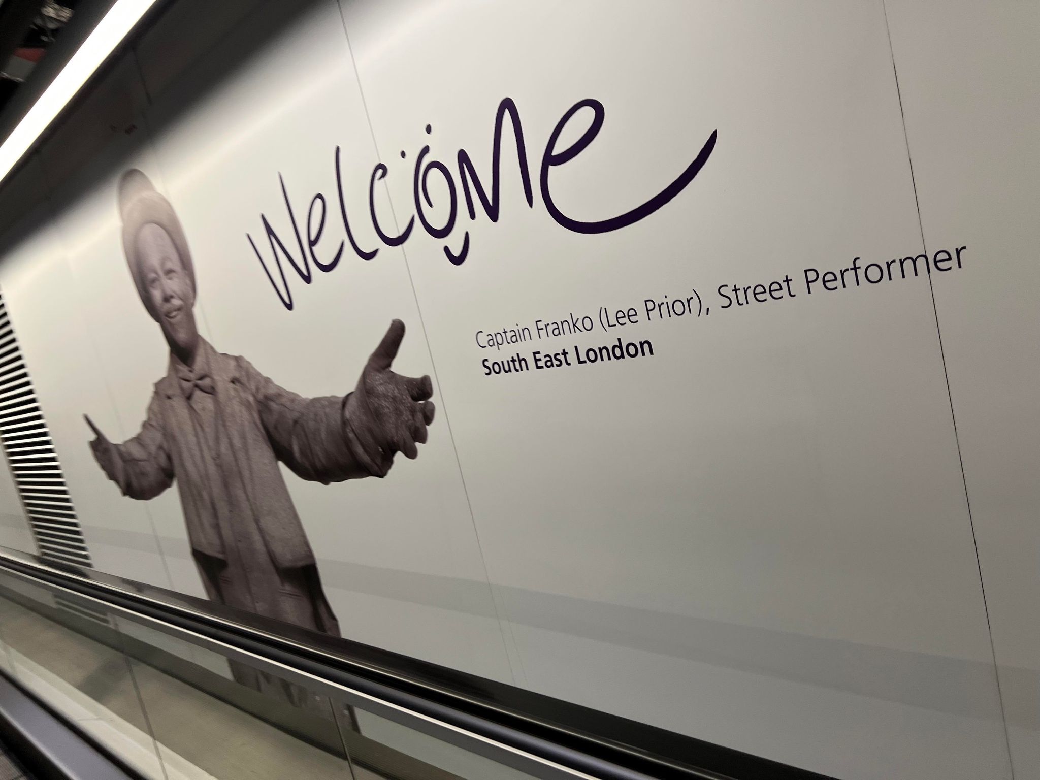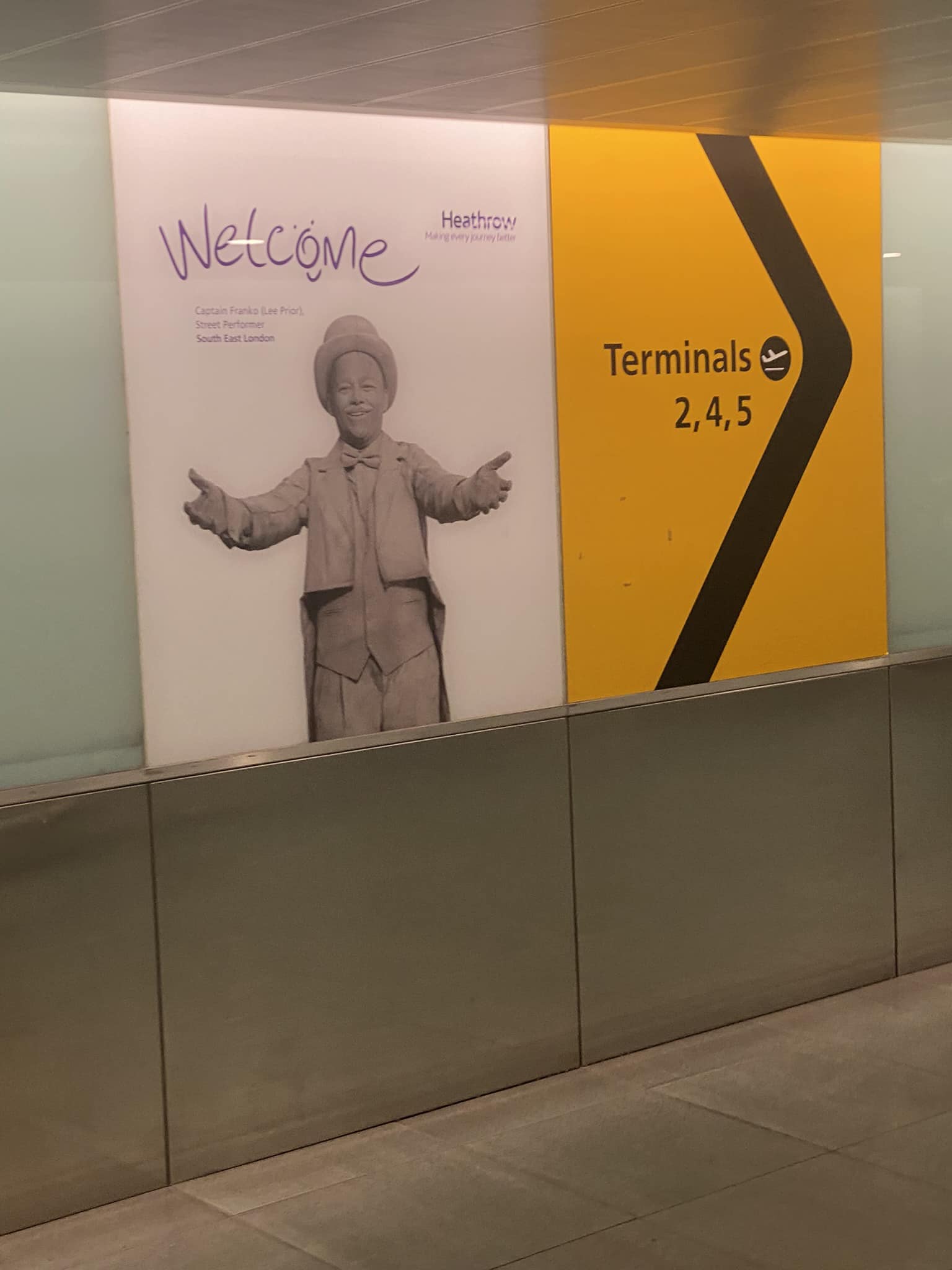 A breathtaking costume, designed to resemble stone, the public’s reaction to its occasional bursts of life are priceless! This living statue was among ten Londoners (out of 10 million!) chosen by Heathrow Airport to welcome passengers on arrival.